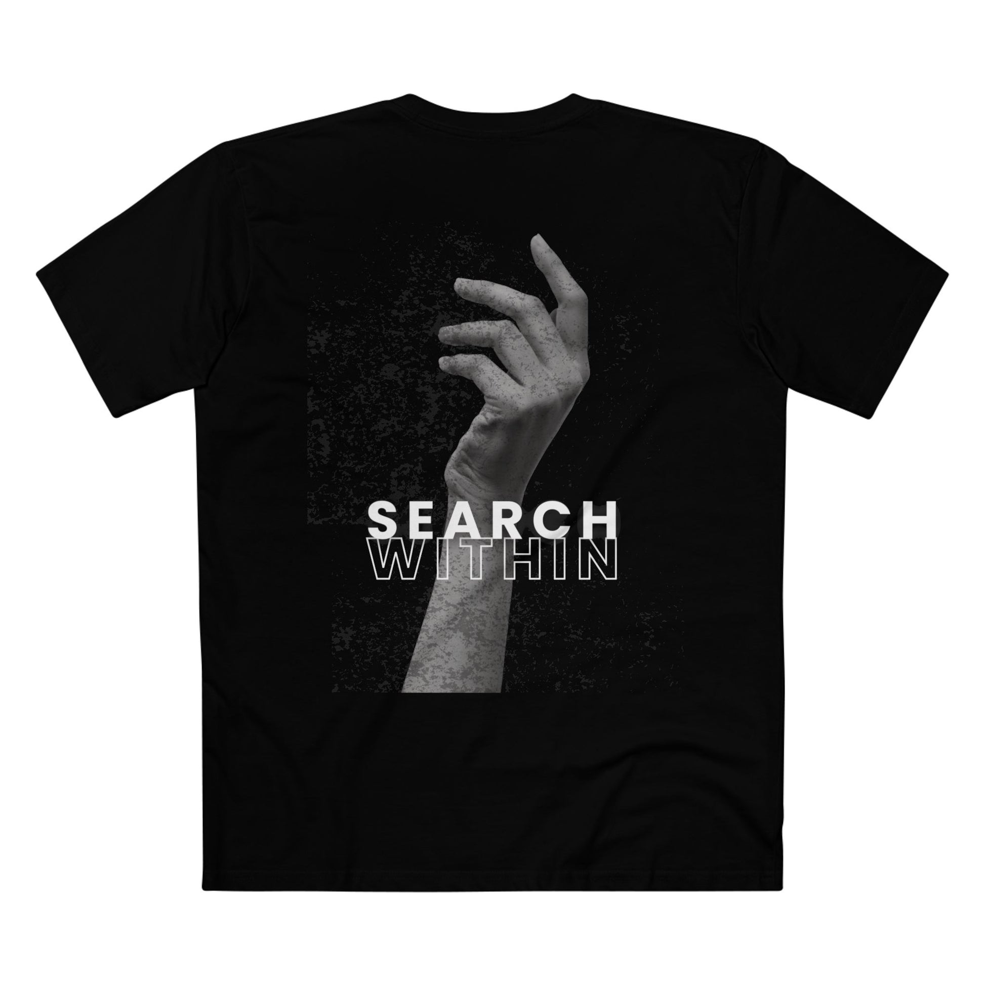 For those days when you feel deep, mysterious, and vaguely philosophical at brunch. This shirt features a striking grayscale hand rising through textured darkness, paired with the words SEARCH WITHIN — because introspection looks better in bold sans-serif. Soft, black cotton meets brooding vibes in a wearable crisis of identity.