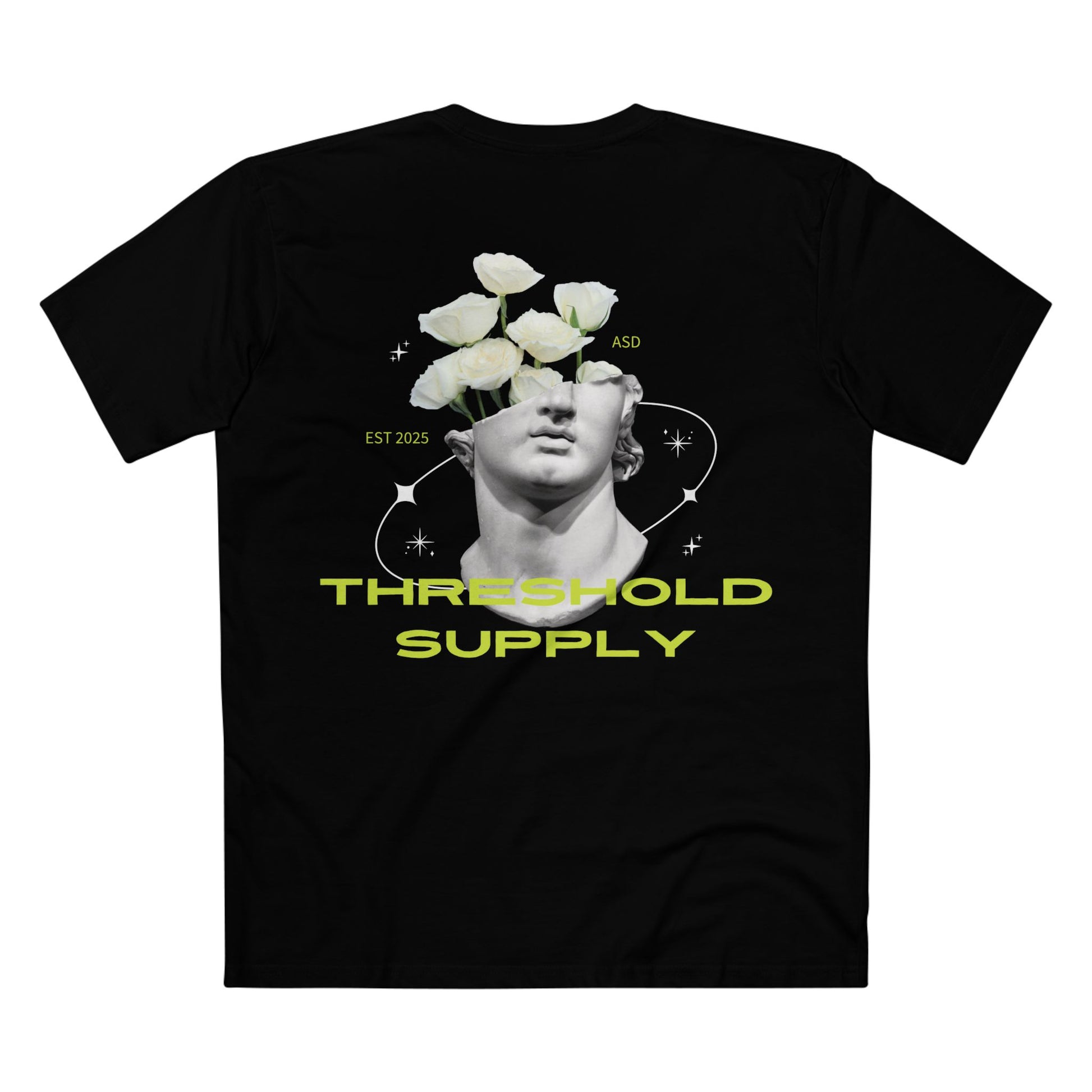 This design is peak “I meditate, but also I have Wi-Fi.” A neoclassical bust sprouts ghostly white flowers from the skull, suggesting that growth is painful, confusing, and weirdly aesthetic. Paired with orbital lines and neon text, it’s giving Greek statue gets abducted by aliens then starts a wellness podcast.